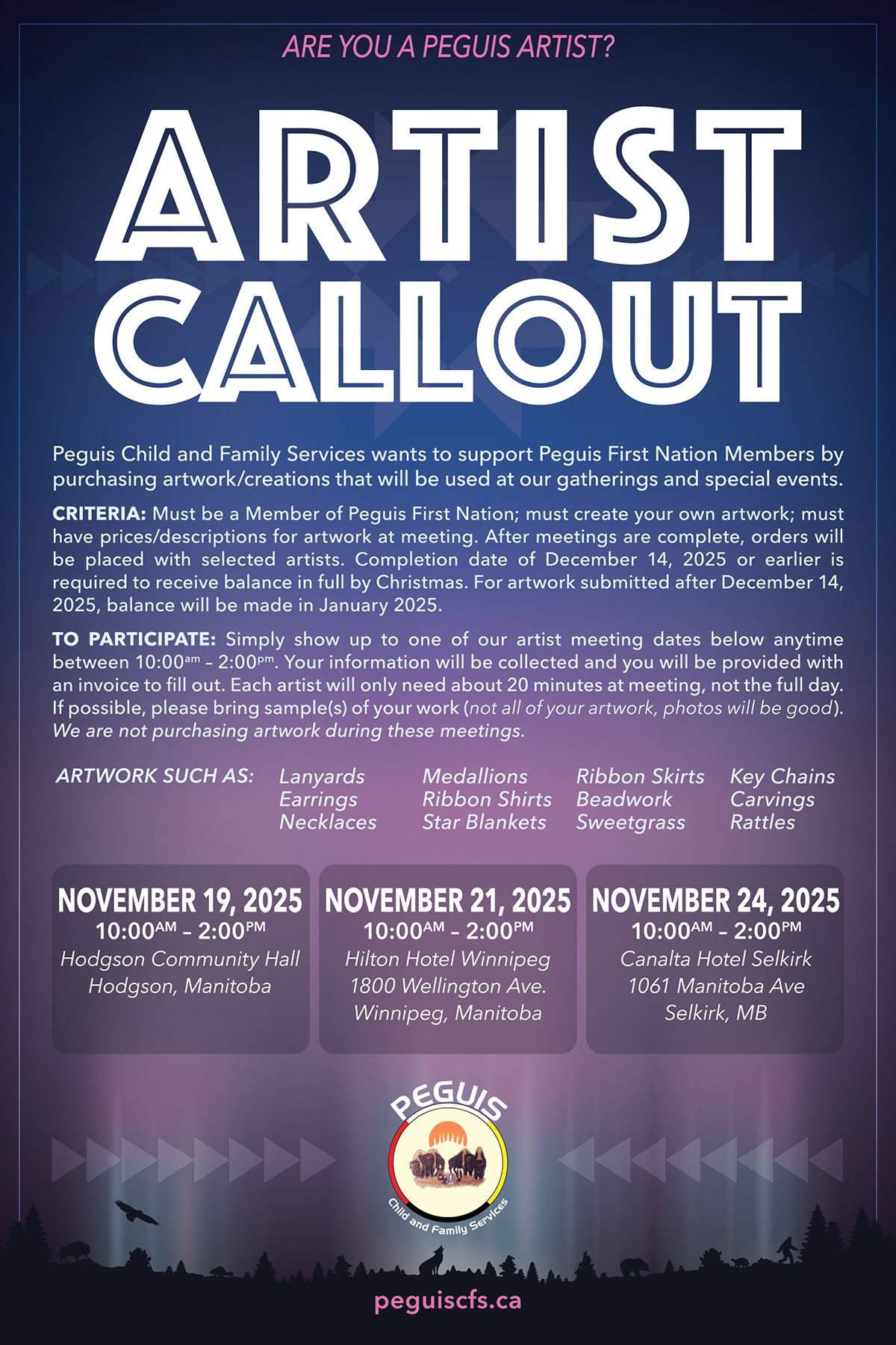 Our 3rd annual Artist Callout is on now! Peguis artists can show up to one of the meeting dates on the poster to meet and show us your work. Selected artists will be contacted with an order.