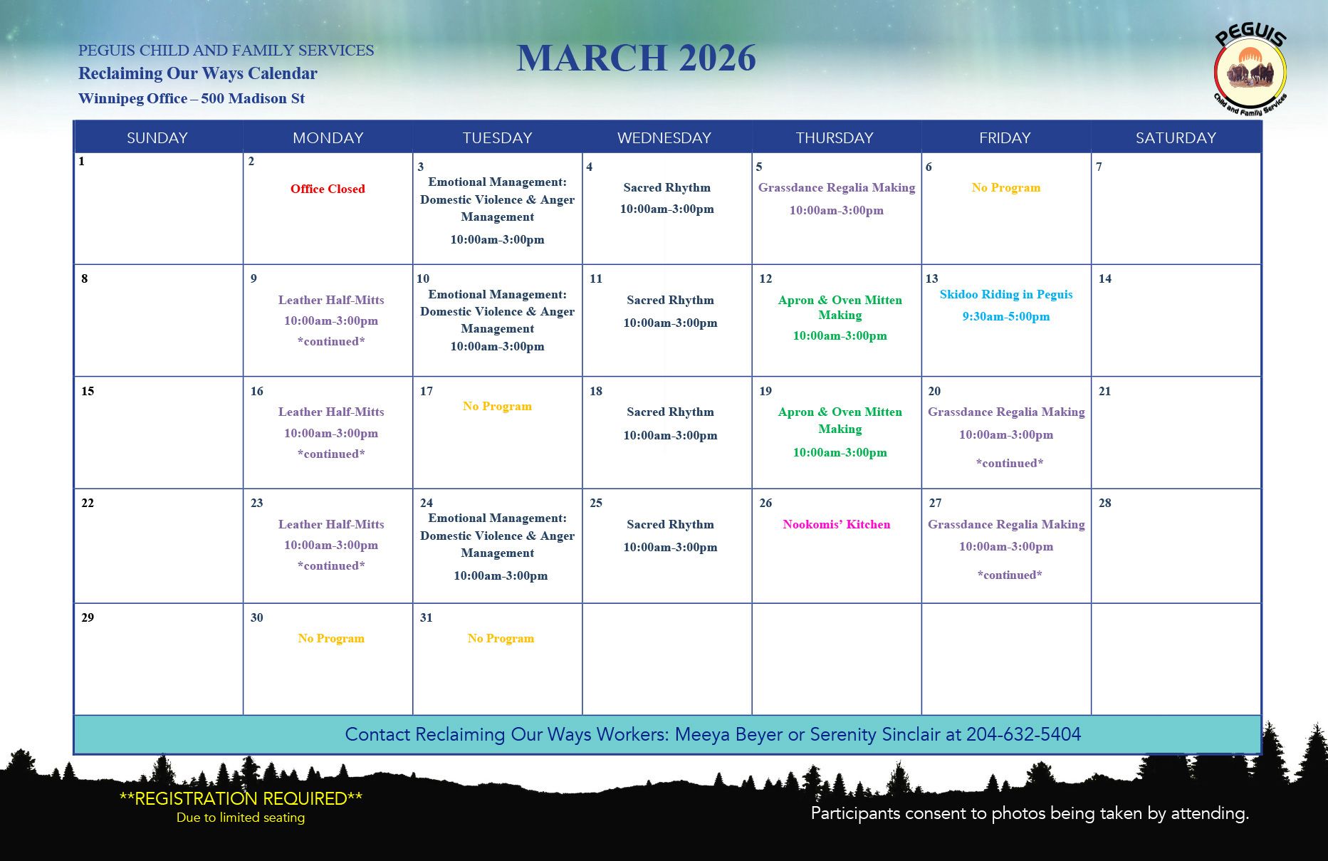 Reclaiming Our Ways, Winnipeg, March 2026 Calendar